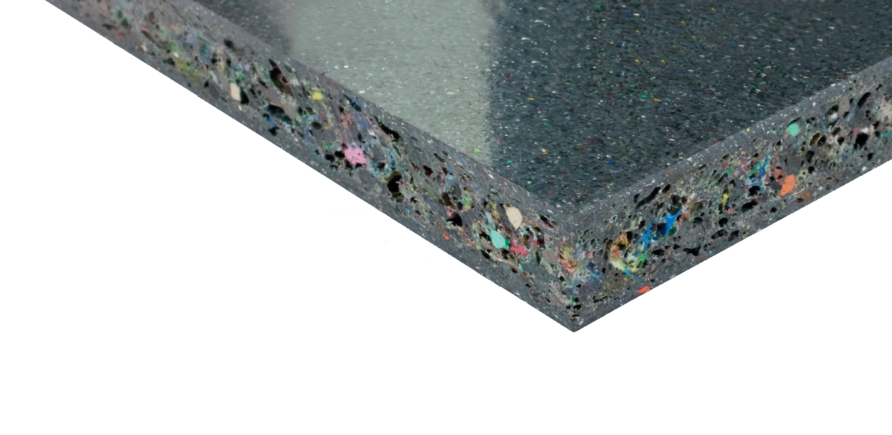 Ekoply 12 mm Dark Grey genbrugsplast er lavet af plastaffald, der er renset, kværnet og smeltet om til en plade Ekoply. Miksturen består af nogenlunde lige dele PE og PP, og så er pladen bundet sammen af en sort farve. Men det er muligt at se spånerne af plast, i alle tænkelige farver, som skinner igennem den sorte farve. Det giver et flot farvespil i pladen, og fornemmelsen af genbrug og bæredygtighed er høj.
